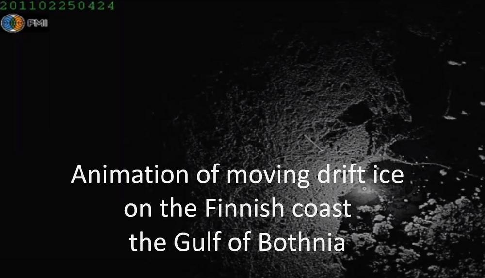 Radar animation of drift ice movements in the Bay of Bothnia in front of Kokkola. On the right side of the coast and in front of it a flat dark solid ice. On the left, a constricted driving ice with a black visible rail. The white moving dots are ships. Video: Mikko Lensu, Finnish Meteorological Institute
